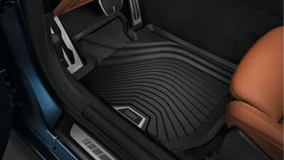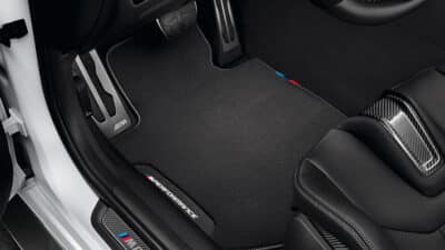 Hochwertige Optik, hervorragender Halt: Die M Performance Fußmatten verleihen dem Fahrzeug auch im Fußbereich eine individuelle sportliche Note. Mit gesticktem M Performance Schriftzug. Eine Einfassung in Lederoptik mit einer Ziernaht in Kontrastfarben und ein eingenähtes Band in den M Farben runden das hochwertige Erscheinungsbild ab.