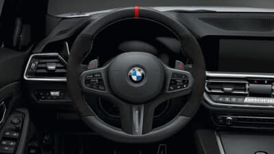 Motorsport pur – extrem ausgeprägter Alcantara-Griffbereich mit großen Daumenauflagen und spezieller Unterfütterung für noch besseren Halt und ein damit verbundenes direktes Lenkgefühl. Der obere und untere Teil besticht durch markante Konturen/Kanten und ist mit hochwertigem Leder bezogen. Die farbige Motorsportmarkierung in 12-Uhr-Position und die silbergraue bzw. dreifarbige (G8x), handgenähte Kreuzstichnaht runden das Thema Motorsport ab.