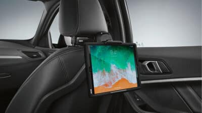 Sicherer Halt für Tablets mit BMW Safety Case (Schutzhülle). Der in verschiedene Positionen und Neigung verstellbare Halter wird an der Sonderausstattung „Travel & Comfort“ oder am Basisträger befestigt.